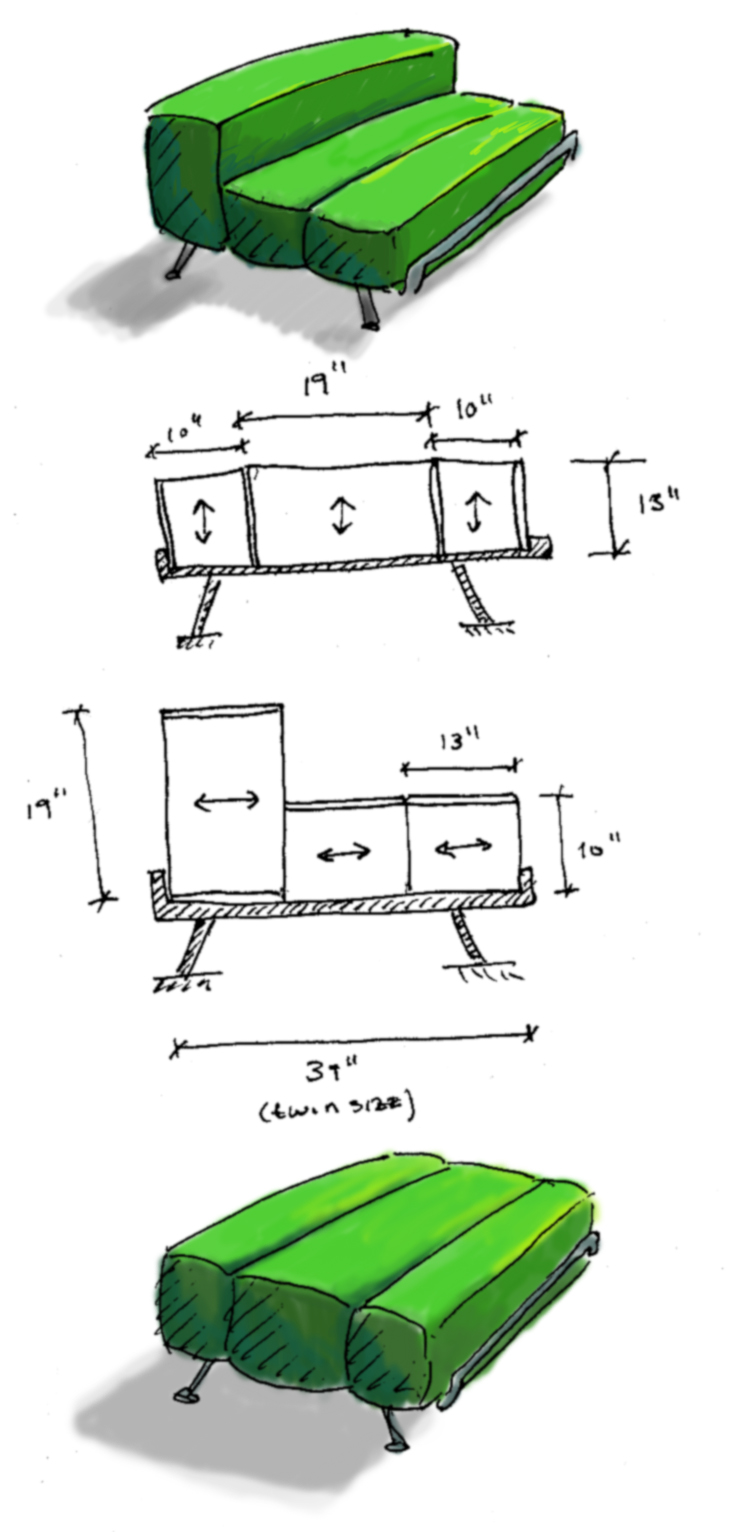 I found this through Dezeen – apparently you extend the front bar and drop the upright cushion down to convert from sofa to bed…