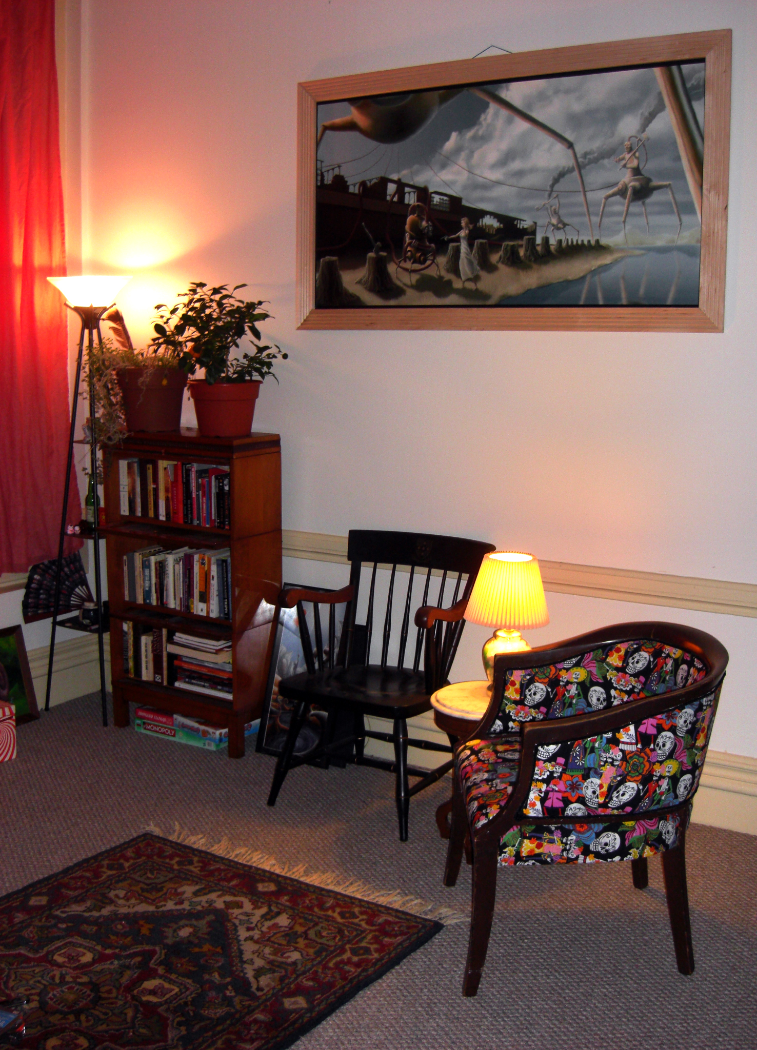 This chair now joins my curtains (found in the dumpster and washed and re-dyed a new color) as well as my speakers (found at the dump and restored with new woofers) in the dumpster showcase that is my apartment.