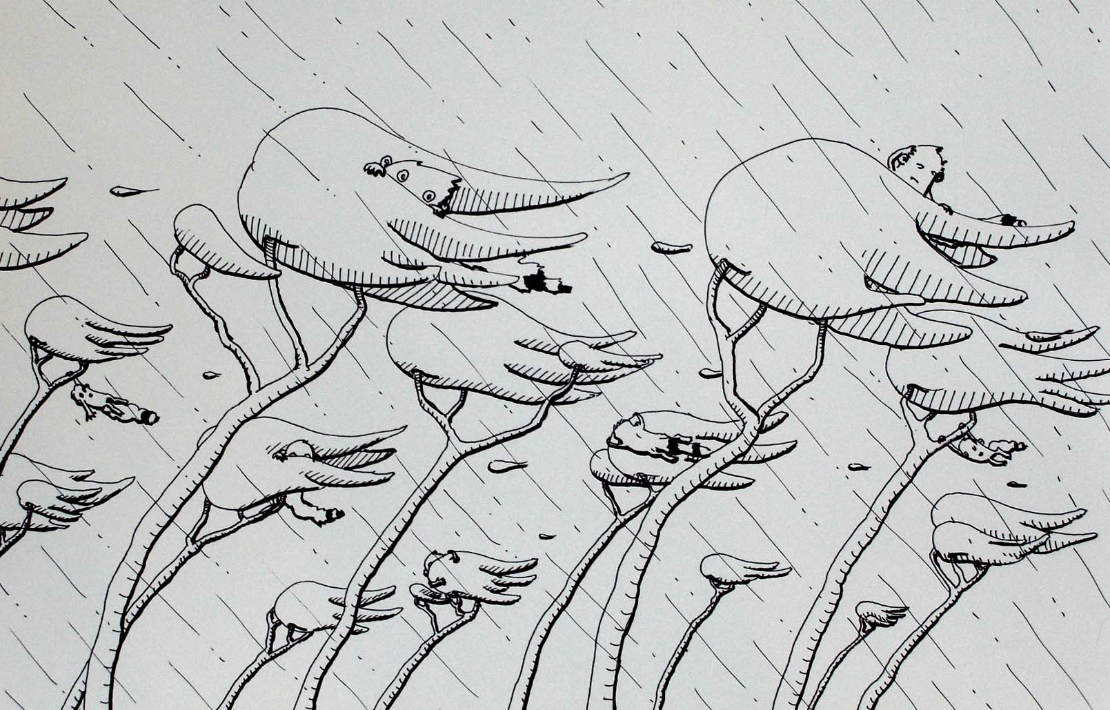 When the Harfowls first moved in, all the trees were the same exact height. They would have stayed that way if a tremendous storm hadn’t hit the forest. All through that day and into the night the storm shook the trees and bent them with such fierce winds that the younger Harfowls could barely hold on…