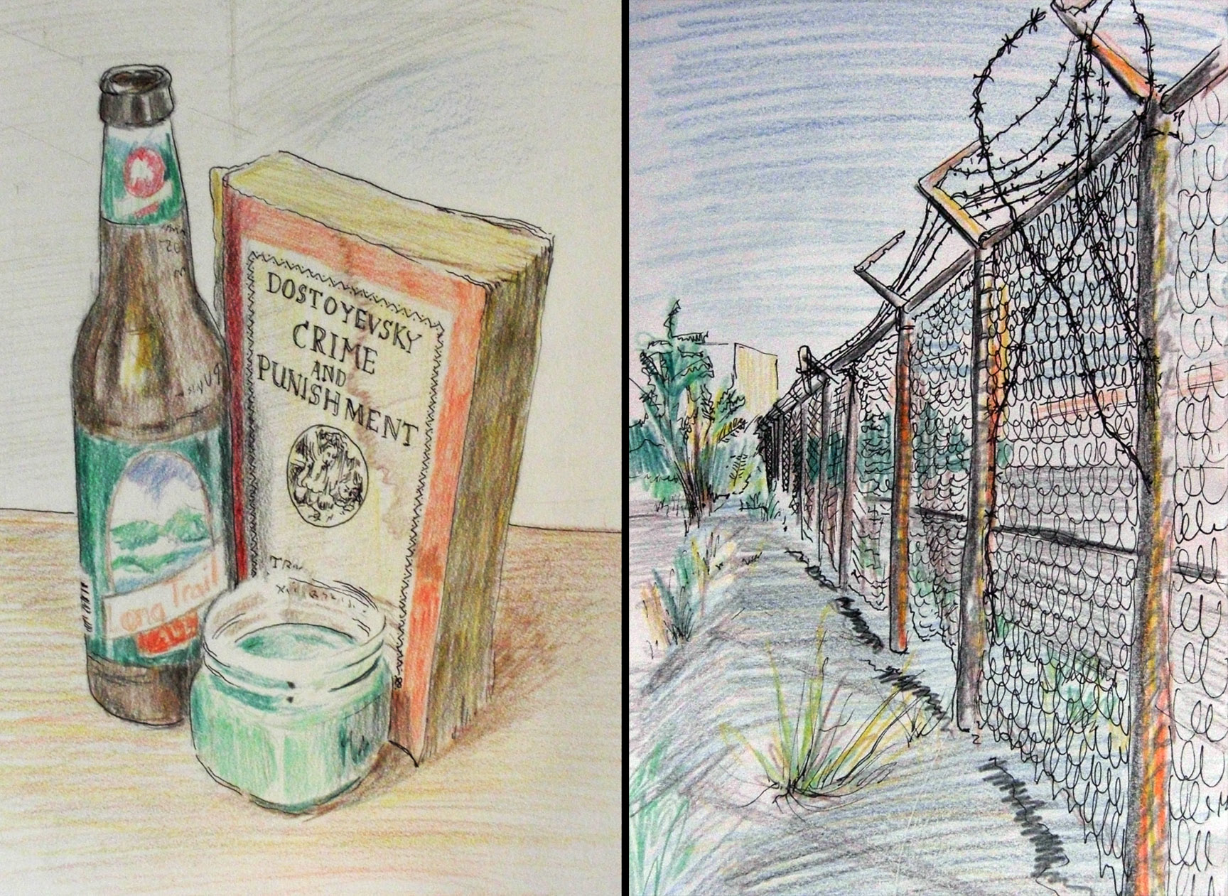 Some colored pencil drawings, one of a parking lot in Worcester and one of some stuff in my apartment: