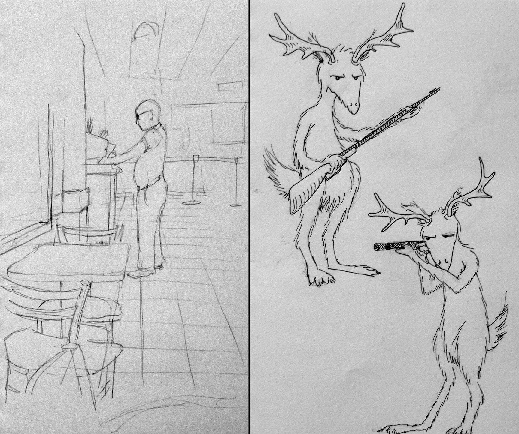 Some sketches and doodles. The sketch is from the inside of a Dunkin Donuts.. I’m trying to get more comfortable drawing in public
