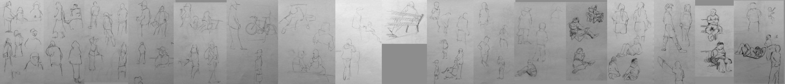 This past weekend was awesome. Spent all day Saturday and Sunday outside with my friend bicycling around the town and sketching. Mostly we just drew people – random people as they were walking by. Very hard but very exciting. Click the image below to zoom in and see all of my people sketches: