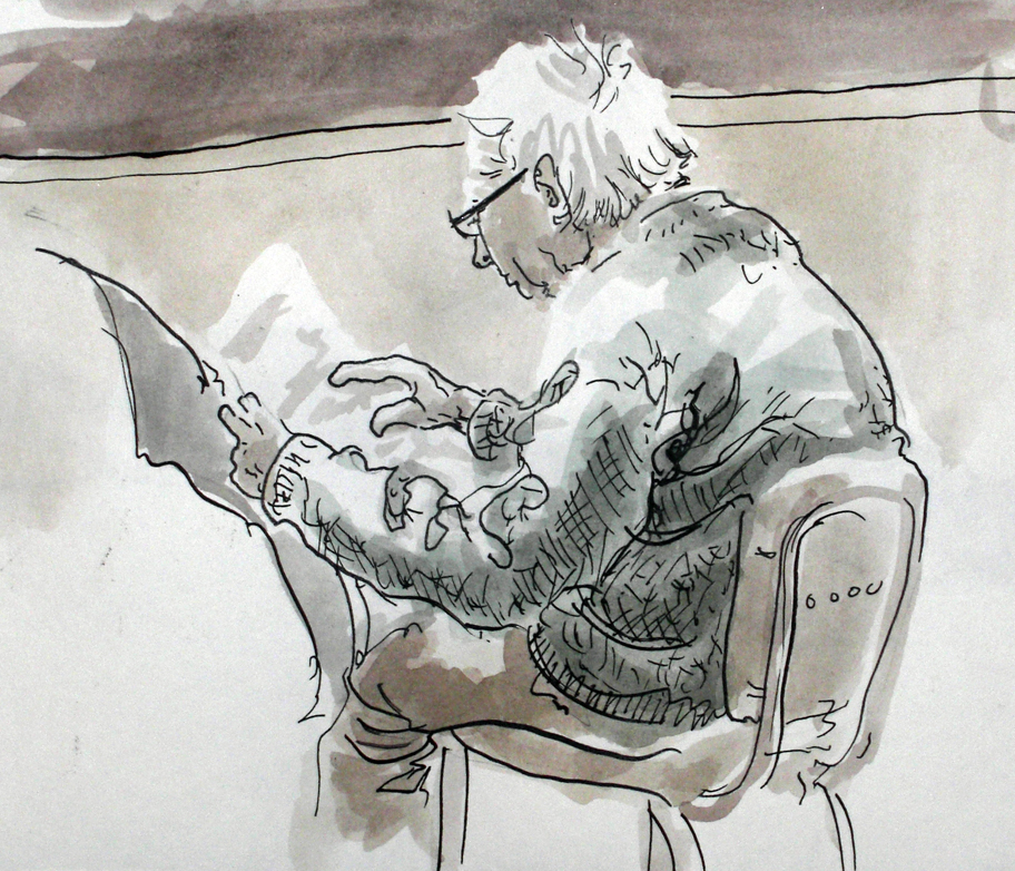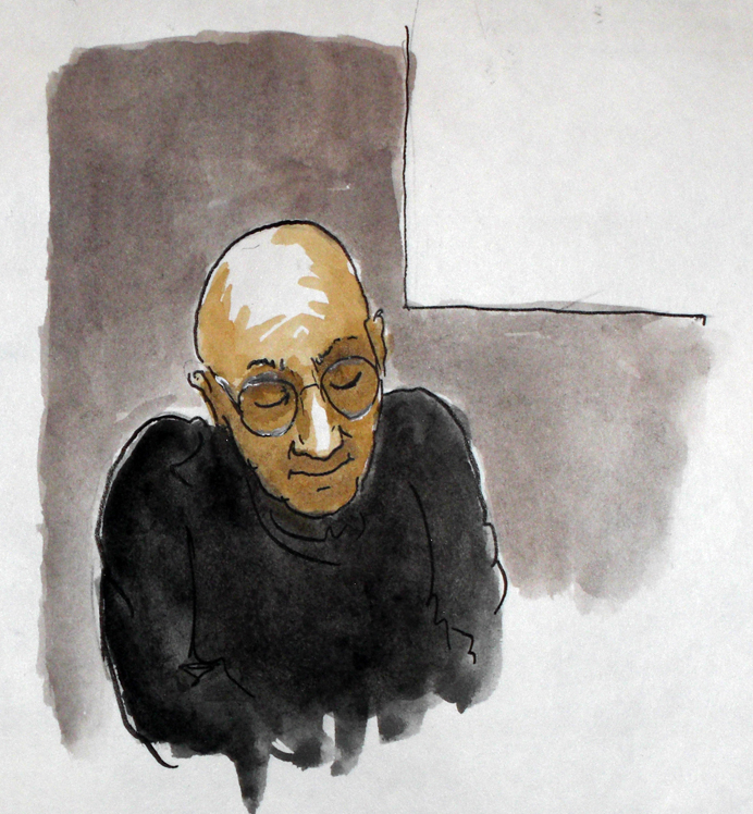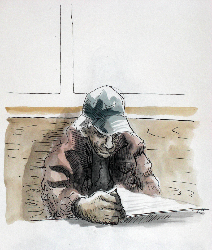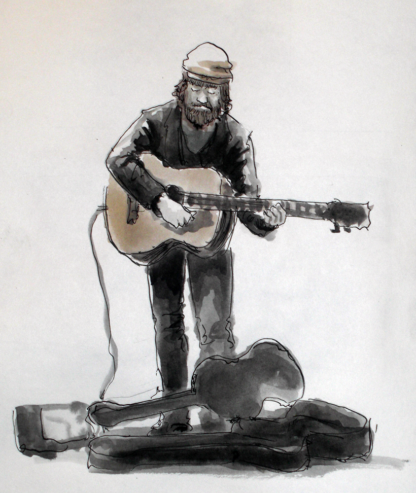 A few notes artistically, in case anyone is paying attention. I’ve started doing under drawings in pencil instead of going straight to pen. I find it helps the proportions and also allows me to use the pen on shadowed contours exclusively. I’ve also been using flatter washes – I was exaggerating the shadows and highlights to the point where it was distracting I think. And I’ve switched from that $150 pen I got for Christmas back to the $5 dip quill I was using before because I find the line more expressive. Oops (-: