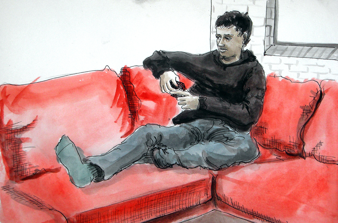 Sam part 2 February 27, 2011 Leave a Comment on Sam part 2 Posted in Uncategorized Share: XFacebookPinterestLinkedin You may recall that I made a quick sketch of my friend Sam on his couch while I was visiting him in Troy. Well today he is visiting Brooklyn, so we decided to make a couch sketch part two.