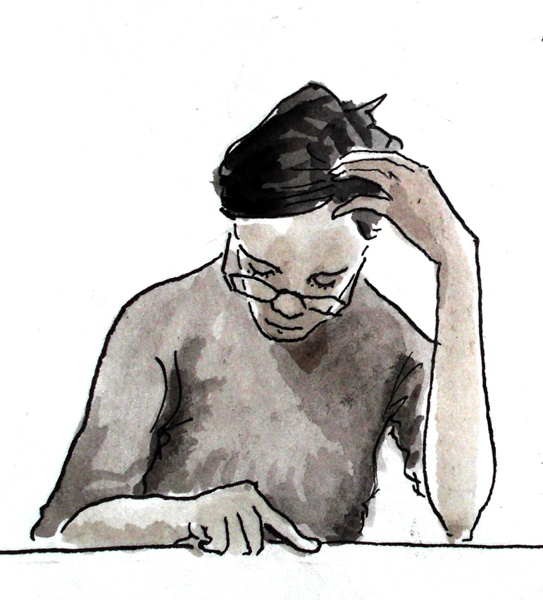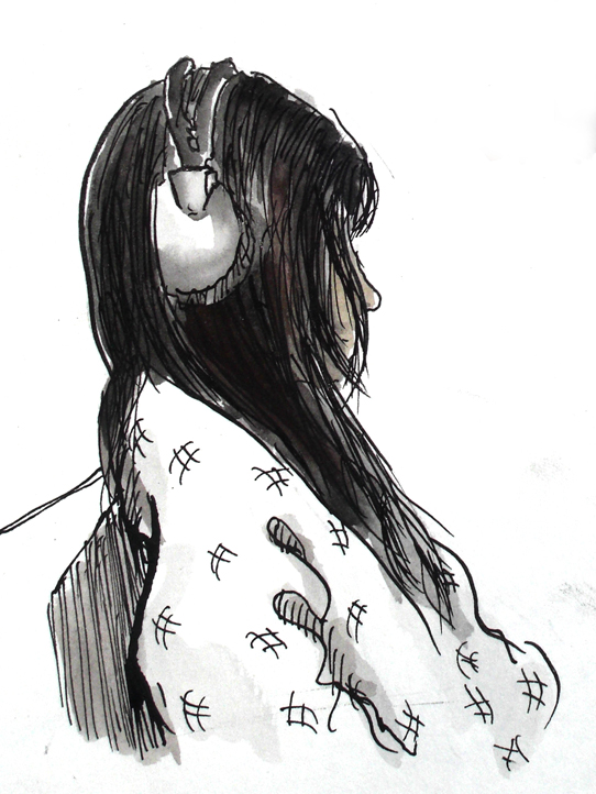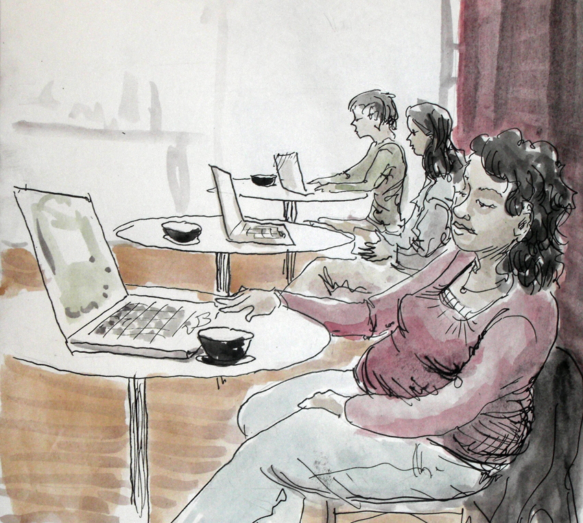 I swear I did not fabricate this drawing. Sitting next to me were three girls on identical Mac laptops drinking the same drink. I felt pretty bad for breaking up the trend being a guy at the last table with no laptop and a regular coffee. (It was pretty cramped in there so I had to draw pretty stealthily for fear of upsetting someone and having them move – thus breaking up the scene. Ergo, the draftsmanship is not that great).