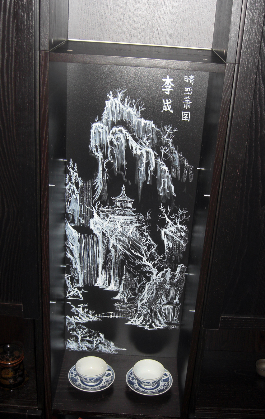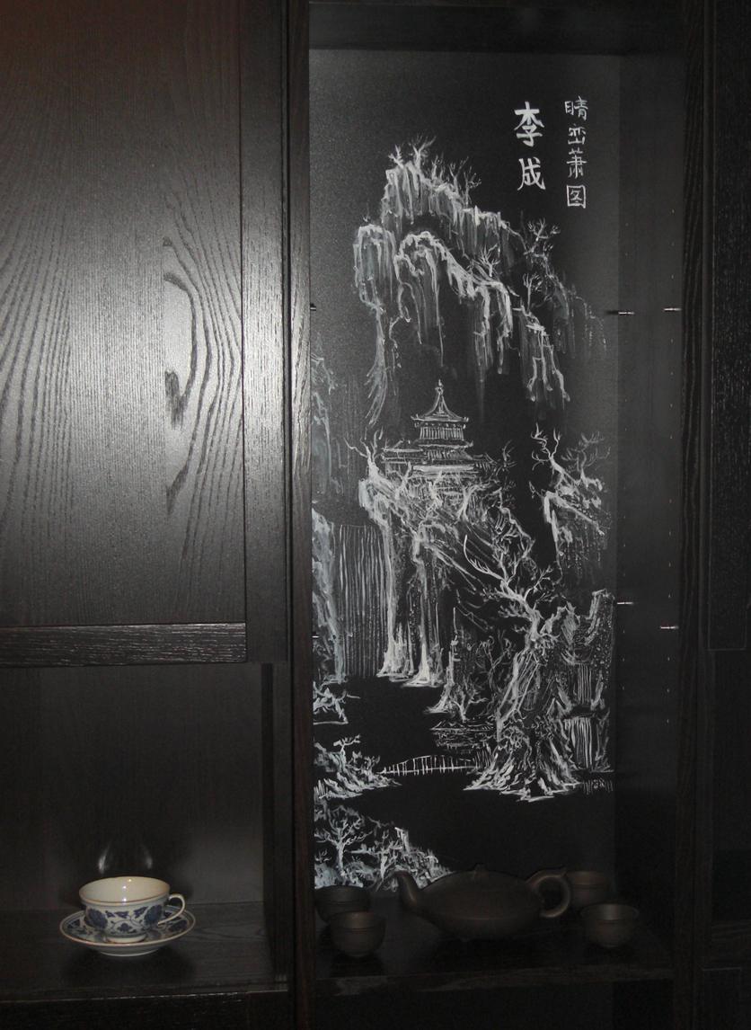 My friends/hosts here just got some new cabinets from IKEA and the central panel didn’t match the rest, so we decided to paint it. This is a rendition of a famous brush painting by Li Cheng. It’s very difficult to do white on black in this style because the line becomes entirely symbolic (it no longer detonates light) but I think it came out alright. The writing is the title and original artist’s name.