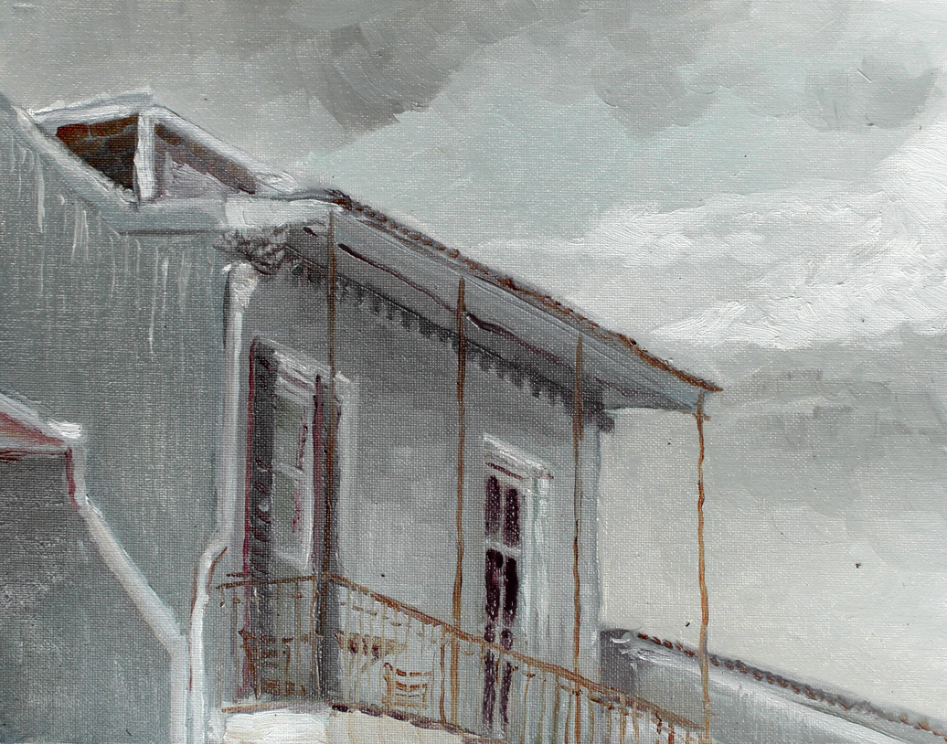 Today I really wanted to try my hand at oil painting again… but the weather didn’t exactly want to cooperate. It was cloudy and sprinkling on and off all day, so my choice of location was mostly dictated by wanting to be sheltered from the rain.