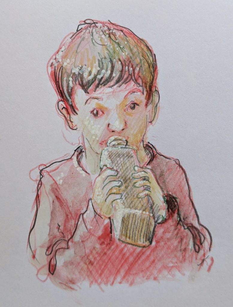 Having some post-swim-class chocolate milk. Using water soluble colored pencils and a brush pen. It’s a nice way to still allow being more painterly, and even going into gauche or watercolor, without having hard pencil or pen lines. But finished this one before I got to the actual painting phase. White highlights are a paint marker.