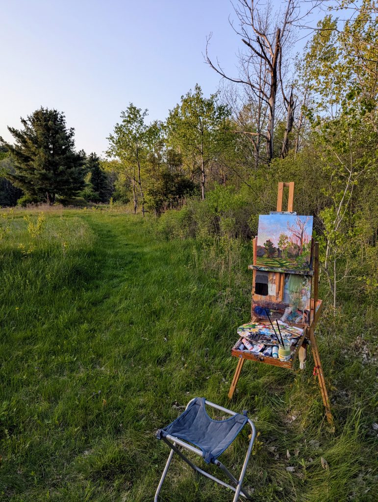I also knew that the long shadows across the grass that define the foreground of the painting – which also caught my eye – would be the first to disappear as the sun dropped. So I painted those quickly, as soon as the rough in and sky were done. By the time I got this photo of my spot the really striking sun highlights on the grass had faded out.
