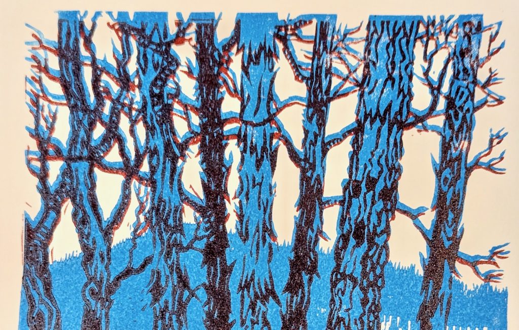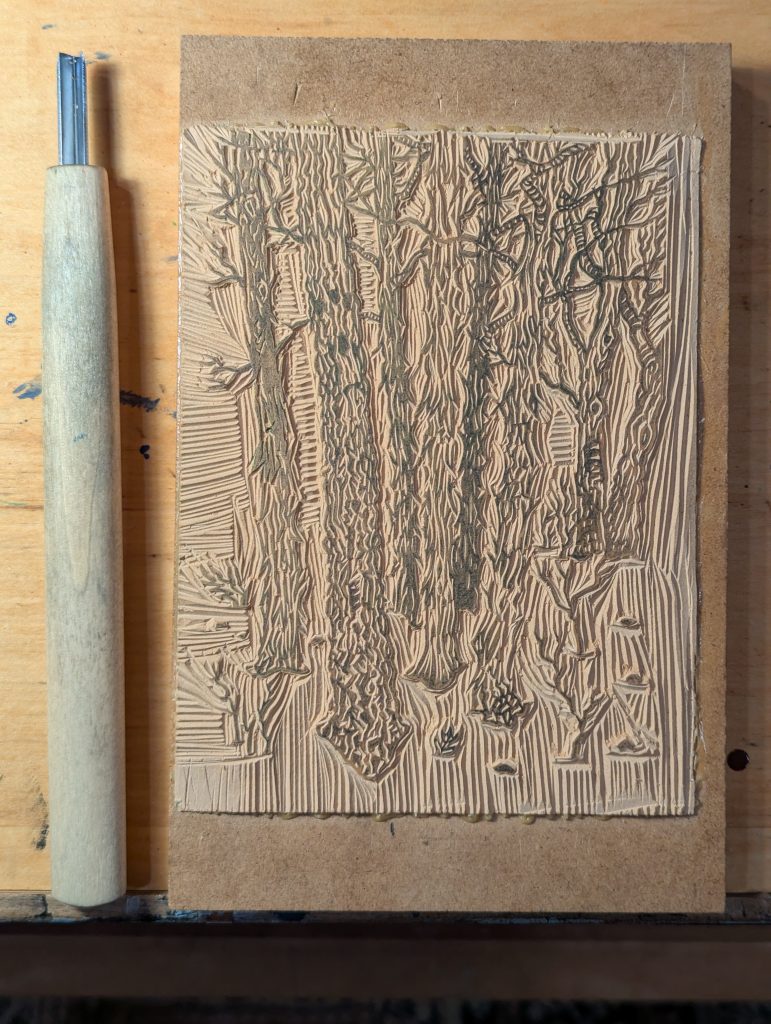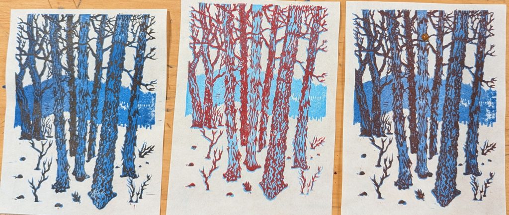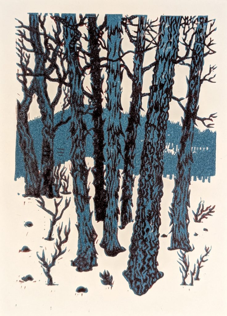 Overall, it was a ton of work. I think I did that to myself by designing a print with a large amount of double-printed detail; all the fine branches print on both blocks. If I had kept the mid-tone to only the tree trunks and the mountain, the print itself would be far more forgiving of slightly misaligned printing. Fortunately, since this is a two-block print and not a reduction print, I still have both blocks, and I can actually go back and carve away the double-printing areas…