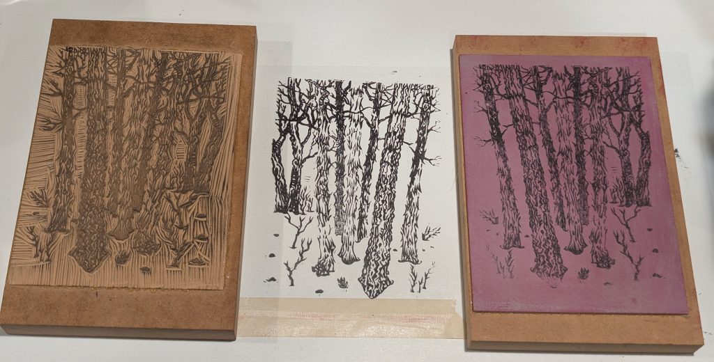 I decided to start by carving the darker block (the “black”), planning to then use that carving to transfer onto the second block. Because so many parts of the image print exactly the same between the two blocks, it was important to transfer the first block carving accurately to the second block. I achieved this using a transfer print process: printing from the first block onto acetate (middle image below), which held the wet ink, and then printing from the acetate onto the second block (right image below). That way the image also reverses twice, so it ends up in the same orientation on both blocks. Then I also had to transfer the portions of the initial sketch that would not print black (the mountain), which I did using a second carbon paper transfer. Overall, it was super tricky—way more work than just using the reduction carving method.
